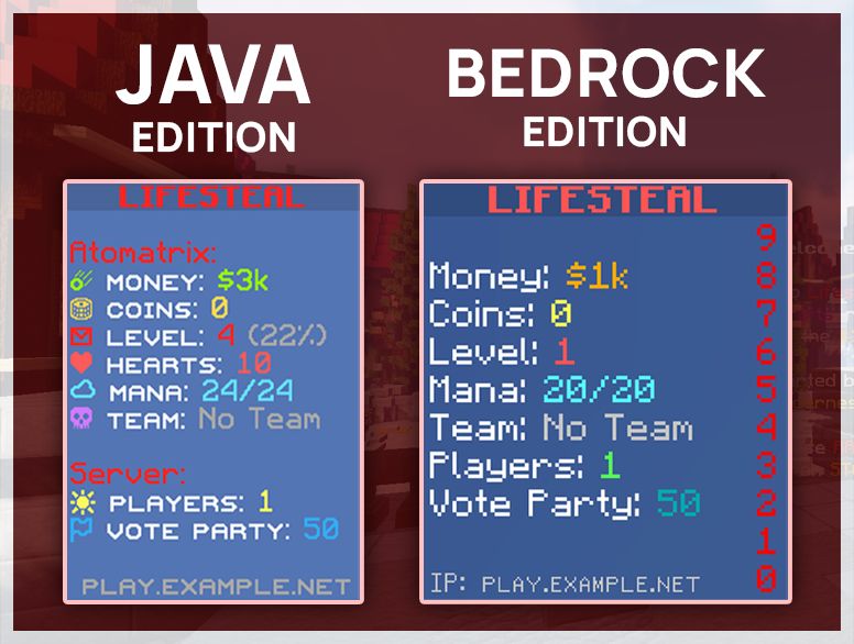 Bedrock support on your server shouldn’t be the second best. It should be just as good as Java! This setup includes a seperate scoreboard catered towards bedrock players, that will only show for them. Since bedrock clients display unicode characters weirdly, they are ommitted and the text is simplified.