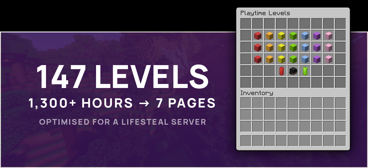 This Playtime Levels configuration is the best out there! It includes 147 Rewards spread across 7 Pages. Players can level up after reaching a certain amount of playtime. Everything is customizable to your liking.